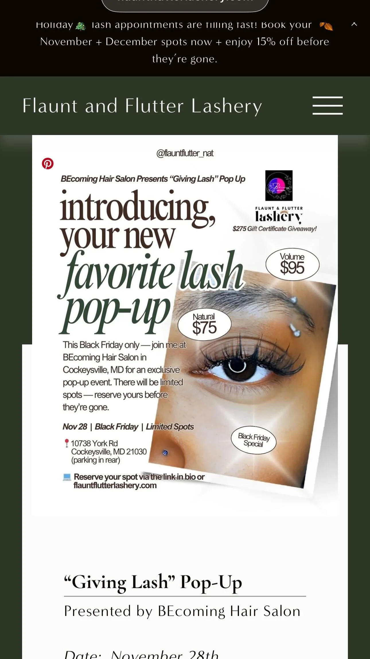 She did my lashes and they look amazing, I'd recommend her to anyone who gets their lashes done professionally. She had me so relaxed I went to sleep as well as my feet. If you want or need your lashes done go to Flaunt and Flutter Lashery & pictures coming soon." - Diamond
